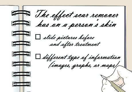 Make a plan for how your PowerPoint will enhance your presentation. The PowerPoint should complement what you’re saying, not replace it. After you determine what all you want to say in your presentation, decide how each point you make can be enhanced by a PowerPoint slide. Then, create those slides! For instance, if you want to make a point about the effect scar remover has on a person’s skin, the slide you use to complement this point could have before and after pictures of a scar that’s been treated with the remover. Once you know what your presentation will be about, make a list of the different type of information (e.g., images, graphs, or maps) that you might want to put on your PowerPoint slides to make your presentation better.
