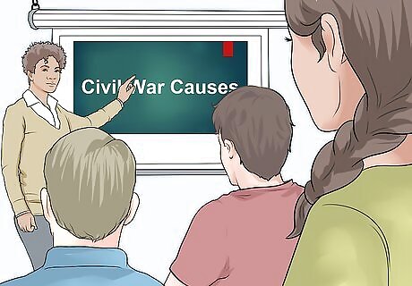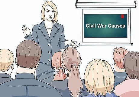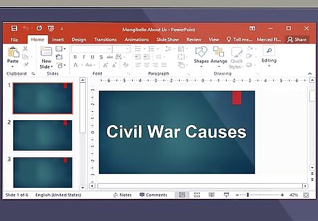 Limit the amount of words you put on each slide. Include only key words and essential information that people absolutely need to see. Otherwise, the audience will focus too much of their attention on reading your slides instead of listening to what you’re saying. For example, instead of writing “There are a wide variety of factors that helped to bring about the American Civil War,” write something short like “Civil War Causes.” You should never have full paragraphs of text on your slides. If possible, avoid even having full sentences on them.