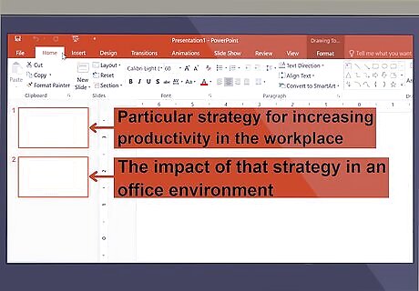 Organize your PowerPoint slides to have a logical flow between them. Use your PowerPoint to tell a story or some kind of narrative about the information that you’re presenting. Make sure that each slide logically flows into the next one. For example, if one of your slides is detailing a particular strategy for increasing productivity in the workplace, the next slide could describe the impact of using that strategy in an office environment. Even if your presentation is largely composed of a lot of data, be sure to talk about the underlying meaning that that data carries.
