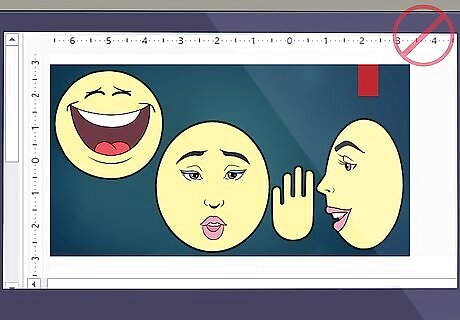 Refrain from using animation or sound effects in your slides. Unless your presentation is meant to be comical, these types of effects might make your audience take your presentation less seriously. Make sure you’re presenting information in a formal, professional way. Usually, it’s best to have all the information on a slide appear at the same time when you click the mouse. You should only “build” the slide (i.e., have a single line of text or image appear each time you click the mouse) if you’re building to a bigger point.