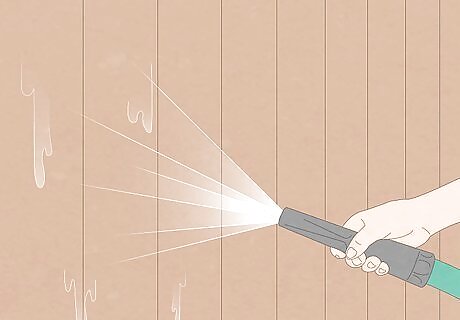 Power wash your fence. Connect your garden hose to a power washer and pull the trigger of the high-pressure hose tip until water comes out. Then start up the power washer engine and hold the tip of the power washer wand about 18 inches (46 cm) away from your fence. Move it along the length of the boards, constantly moving it to avoid gouging the wood of your fence. Spray your entire fence, using different angles to get into inside corners. Allow your fence to dry for 24 hours after power washing, before moving on to the next step.