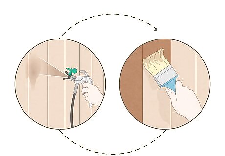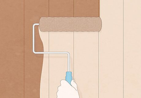 Brush or roll your sprayed surface immediately if you pump sprayed it. First, roll your brush or roll with the grain. Then, "buckbrush" to make sure you're getting the stain into all of the corners, gaps, and crevices with your brush or roller. Stain starts to soak into the wood pretty quickly, so do this step immediately after you spray the stain. Use a clean or new brush or roller that is between 2–4 inches (5.1–10.2 cm) for the best results.