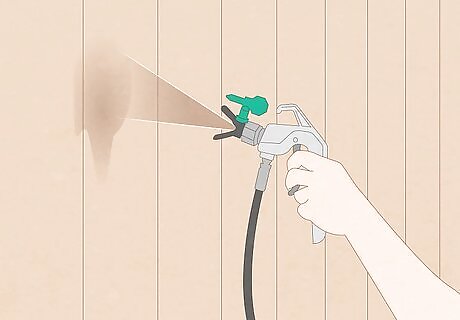 Apply the stain to a small area of your fence with a pump sprayer if you have one. Some wood stains for outdoor decks and fences come in a pump sprayer container for your convenience. Hold the nozzle of the pump sprayer about 1 foot (0.30 m) from the fence surface and spray an even coating on an area of about 2 square feet (0.19 m). Follow any other instructions or safety precautions listed on the pump sprayer container. If you don't have a pump sprayer, you can brush the stain on instead.