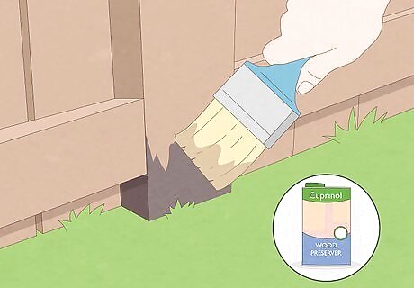 Apply wood preservative to your base posts. The areas that rot first in a fence are always the posts near where they enter the ground. Brush a small amount of wood preservative, such as Cuprinol, along the wood of your base posts near where they enter the ground. A product like Cuprinol was most likely used on the wood below the ground when your fence was installed, if it was installed properly. You're just reinforcing the extra protection above ground.