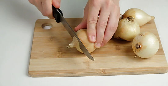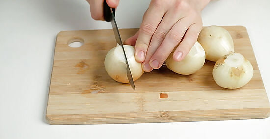 Chop of the root ends and the onion tops. Place the onions on a cutting board, and cut off the tops and roots with a large, non serrated knife. Make sure keep your fingers away from the knife blade.