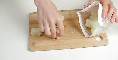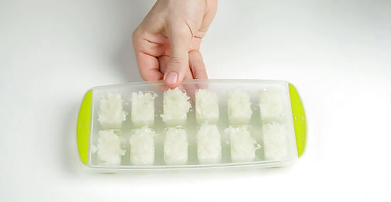 Pour the puree into ice cube trays and freeze. Let the cubes freeze overnight. Once they are all frozen, take them out of the ice cube tray. They should be totally solid, so if they still seem mushy, freeze them for longer.