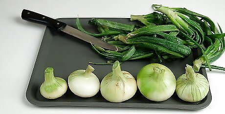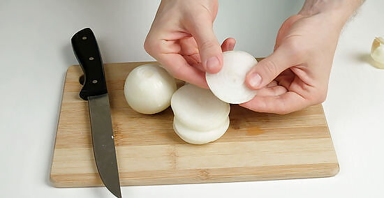 Peel the onions and slice them into ⁄8 in (0.32 cm) rings thick. Peel off the outer paper shells of the onions, then cut off the tops and root ends of each one. Place an onion on a cutting board, then slice it into ⁄8 in (0.32 cm) using a large, non-serrated knife. Remember to always use caution when you're using a knife. Hold the onion securely with your free hand so it doesn't slip when you're cutting it. As you do that, be sure to keep your fingers curled in toward the palm of your hand so you don't cut yourself.