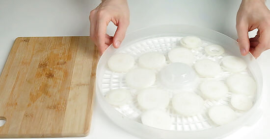 Place the onion slices in a dehydrator at 140°F (60°C) until they’re nearly dry. Check their drying progress every hour. Depending on the onions and humidity, it may take 3 to 9 hours to get the onion rings almost all the way dry. Stop before they are entirely dry to prevent browning them.