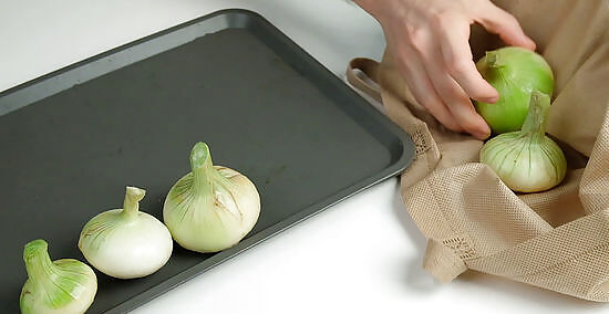 Place the onions in mesh bags. The mesh will make sure they stay dry. If you have lots of onions that you want to keep organized after a harvest, sort the onions by size and place them in separate mesh bags. Do not wash your onions before storing them. The dampness from washing the onions would be the perfect habitat for mold.