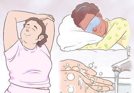 Maintain a healthy immune system with hand-washing, diet, and sleep. To keep your immune system strong enough to fight off germs that cause ear infections, wash your hands throughout the day. Also, make sure that you eat healthy foods and avoid unhealthy foods. Get at least 8 hours of sleep every night as well. Try to avoid being around people who are sick with the common cold or who have upper respiratory illnesses. Even though you're washing your hands often, don't stick your fingers in or around your ears.