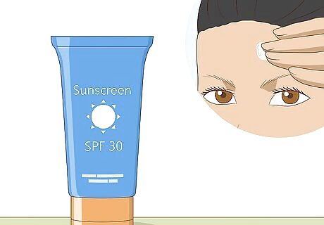 Wear a sunscreen that's SPF 30 or greater every time you go outside. Over time, the sun's rays can cause damage to your skin. In turn, that can lower the elasticity, making you more prone to wrinkles. Since your forehead is often exposed to the sun, make sure you're protecting it with sunscreen. You can even get daily moisturizers that have sunscreen in them. If you're going to be outside all day, wear a hat to protect your forehead and face from the sun.