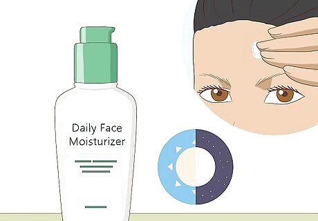 Apply a daily moisturizer in the morning and at night. Dried-out skin ages more quickly, which can lead to developing wrinkles earlier. Using a moisturizer will help keep your skin hydrated and provide it with the nutrients it needs to stay healthy. Wash your face first, then gently rub a cherry-sized amount of moisturizer into your forehead and face using gentle circles. Look for a moisturizer with retinol and vitamin C to help prevent wrinkles. At night, you may want to pick a heavier cream moisturizer, which will provide more hydrating power.