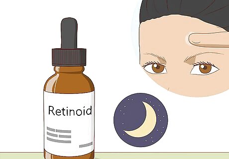 Use retinoids treatments once a day if you want. Apply these treatments at night before you go to bed. They help your skin produce more collagen, which is what gives it elasticity. That can help reduce wrinkles over time. Because they can dry your skin out or cause irritation, try them every other night at first. After a couple of weeks, you can increase to once a day. Over-the-counter, look for treatments with retinol in them. You can also get prescription treatments from a dermatologist, such as tretinoin, tazarotene, and adapalene. Some moisturizers already contain retinoids, so check your ingredient list.