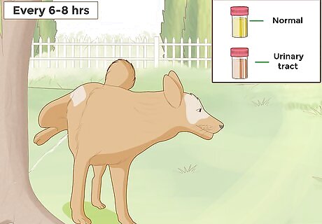 Allow your dog to go potty often. A healthy adult dog must have the opportunity to relieve itself of urine every 6 to 8 hours. Smaller dogs, puppies, or dogs with medical problems of the urinary tract will need to urinate more often, at least every 4 hours. If you are cannot take your dog out as often as he needs to be, you may want to consider installing a doggy door so that your dog can access an enclosed back yard, training your dog to use potty training pads in the house, or hiring a dog walker to walk your dog a few times a day. About once per week, observe your dog as it urinates. If the urine is a dilute yellow color, then his urine is normal. If your dog’s urine is brown or red and/or if your dog has trouble urinating, then you should contact your dog’s veterinarian right away.