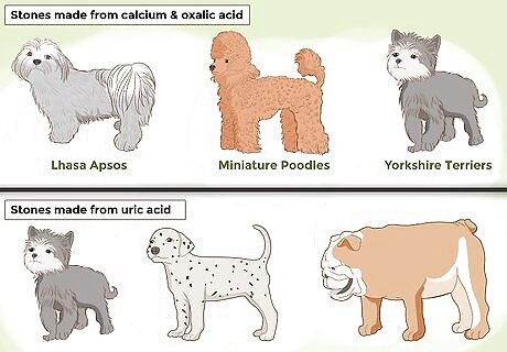 Keep in mind that some breeds are more likely to get kidney stones. Certain dog breeds are more susceptible to kidney stones than others. It is good to know if your dog is one of these breeds so that you can check for symptoms more often. Lhasa Apsos, Yorkshire Terriers, and Miniature Poodles are more susceptible to kidney stones made of calcium and oxalic acid. Dalmatians, Yorkshire Terriers, and English Bulldogs. are more susceptible to kidney stones made of uric acid.