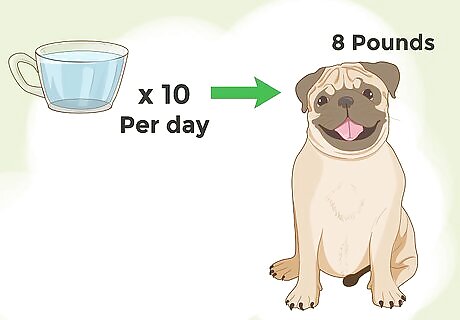 Give your dog the right amount of water every day. The amount of water a dog needs every day is related to its body weight. A dog needs about an ounce of water per pound of body weight per day. For example, an 8 pound dog will need a cup of water per day and an eighty pound dog will need 10 cups of water a day. Keep in mind that if your dog is physically active, pregnant, or nursing, then he will need more water. Provide extra water in hot weather. Provide your dog with a reliable source of clean, fresh water at all times, especially during hot weather. Provide unfrozen water in cold weather. Dogs cannot obtain the amount of water they need from eating snow or ice. In fact, eating snow and ice requires more body energy to melt the snow/ice which makes the dog’s body require even more water.
