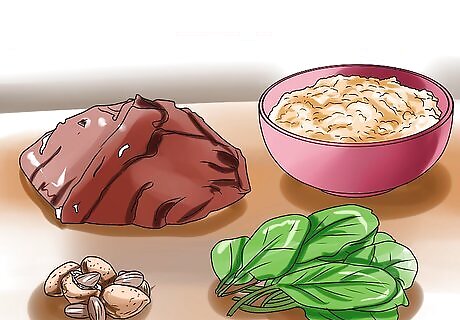 Eat foods containing folate. Folate is a water-soluble B vitamin; folic acid and food folate are both sources of folate. Folate deficiency can cause your bone marrow to have difficulty making enough platelets. The recommended daily intake of folate varies, but adults should usually have between 400mcg and 600mcg a day. A full list of recommended daily allowances by age can be found at the National Institutes of Health website here. Beef liver, leafy and dark green vegetables, legumes, fortified cereals, and nuts are good sources of folate.