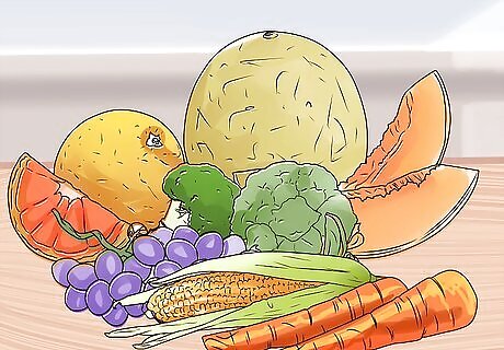 Eat a balanced diet of fresh food. Eat a wide variety of foods, particularly different fruits and vegetables. Eating widely will help your body get all of the nutrients it needs. In addition, try to eat locally; buy produce when it's in season in your local area. Not only will you be getting the freshest produce, but there's also less chance it has any additives or pesticides in order to keep it fresh for transport across long distances. Visit the grocery store often to shop for fresh produce because the nutrient content decreases with time. Instead of doing all of your shopping on one day, plan to go to the store a few times per week. Always choose fresh varieties over frozen and canned foods. For example, if you have the choice between fresh corn on the cob and canned corn, go for the fresh.