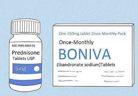 Ask your doctor about your medications. Some medications, such as corticosteroids like prednisone, decrease your body’s absorption of calcium through the intestines. If you have other risk factors for osteoporosis, speak with your doctor to determine a safe dosage. Taking the lowest possible dose for the shorted time will decrease inflammation without increasing your risk of osteoporosis as much. If you must continue to take corticosteroids or are otherwise at high-risk for osteoporosis, ask your doctor about medications that can help treat or prevent osteoporosis. Medications include ibandronate (Boniva), alendronate (Fosamax), risedronate sodium (Actonel), and zoledronic acid (Reclast). Hormones including estrogen products may also reduce your risk of developing osteoporosis.