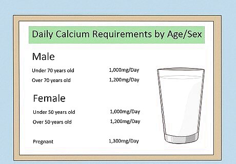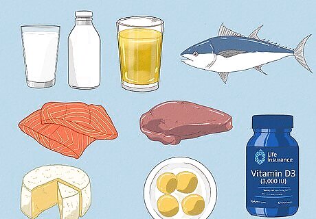 Consume more vitamin D. Vitamin D helps improve your body’s ability to absorb calcium, and is necessary for bone growth. Men and women under 70 should get at least 600IU of vitamin D daily; people over 70 should increase this to 800IU daily. Vitamin D does not occur naturally in many foods. Fatty fish, such as swordfish, salmon, tuna, and mackerel are the best sources of natural vitamin D (and also provide omega-3 fatty acids). Beef liver, cheese, and egg yolks contain small amounts of vitamin D. Milk is commonly fortified with vitamins A and D. Many beverages (such as orange juice) and cereals are also enriched with vitamin D. You can check the nutritional content of many foods by consulting the USDA National Nutrient Database. Vitamin D is also available as a dietary supplement. It is available in two forms, D2 and D3. Both seem equally potent in regular doses, although D2 may be less potent in high doses. For people who live in areas with less sunshine or who have dark skin, taking higher doses of vitamin D supplements may be necessary. It is rare to develop vitamin D toxicity through supplements.