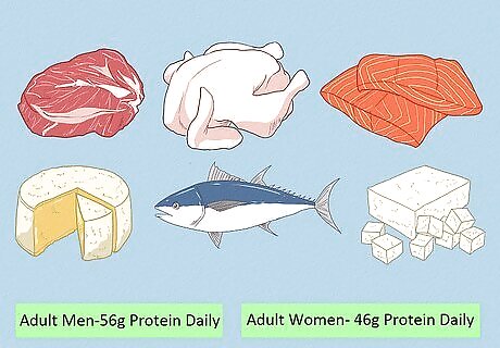 Get enough protein. Many older adults don’t get enough protein in their diets. About 50% of your bone volume is made of protein.Adult women should get at least 46 grams of protein daily, while adult men should get at least 56 grams daily. However, extremely high-protein diets such as the “Atkins diet” may be associated with increased risk of osteoporosis or bone fracture. Some other studies indicate that high-protein diets don’t have any effect on bone health, but it’s best to consume protein (and all things) in moderation. Eat plenty of fruits and vegetables, especially those high in potassium, to counteract any negative effects on calcium absorption from protein consumption. Protein sources that are also rich in calcium and vitamin D, such as fatty fish, are a smart choice. Animal protein that is high in saturated fat, such as red meat and dairy, can cause health issues if over consumed . Get your protein from a variety of sources, including lean meats, eggs, and vegetables and whole grains.