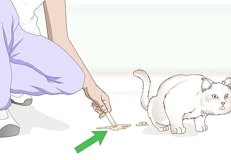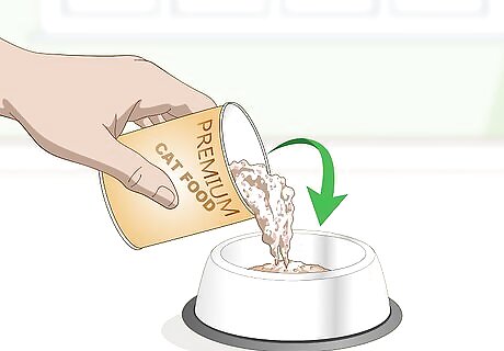 Give your cat wet food. If your cat doesn't drink enough water, you can get water into its system by giving it wet food. By giving your cat at least fifty percent wet food, you increase its water intake dramatically and decrease its chances of getting stones. As with all food changes, introduce a new wet food gradually. An abrupt change can be bad for your cat's digestive health. To choose a good wet cat food, make sure that the cat food’s main ingredient is animal protein – like chicken, tuna, beef, or turkey. A high-quality food will list this as the first ingredient. Foods that list “meat” or “meat products” may not be high-quality. Look for high-quality grains as secondary ingredients, too, which will add carbs to your cat’s diet. The first five ingredients or so should be protein, followed by grains. High-quality foods will also contain taurine and arachidonic acid, vitamins and minerals, and a minimum of additives and preservatives. Look for the AAFCO certification label, too. This means that the food has been tested and deemed safe for pets.