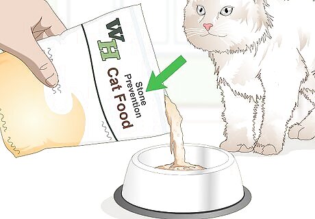 Feed a cat food designed to prevent stones. If your cat has a history of stones, you should discuss changing its diet with your vet. There are prescription diets that promote acidic urine for cats that have a prior history of stones. Check with your veterinarian for the correct type of food for your cat's specific dietary needs. Always choose a prescription diet that is wet food over one that is dry food. Your cat will get more water in its diet, and thus decrease its chance of developing crystals, if it eats wet food.