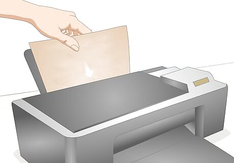 Put the burlap in an inkjet printer so that it will print on the fabric side. If you’re not sure whether to load your printer with the burlap facing up or down, test the printer with a piece of paper. Write the word “top” on the top side of a paper, and print a sentence on the paper. If the printed words are on the same side as the word top, then put your burlap in the printer fabric-side up. If the printed words are on the opposite side, put in the burlap fabric-side down.