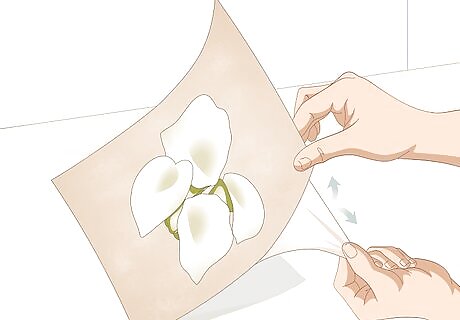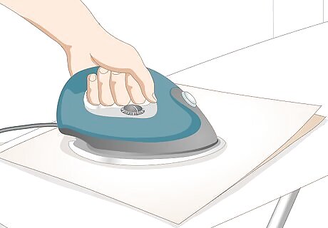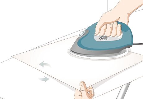 Iron the freezer paper onto the burlap until it sticks. Put your burlap down on the ironing board. Place the shiny side of the freezer paper face-down on top of the burlap. Use a hot, dry iron to press the paper onto the fabric. The heat of the iron will adhere the freezer paper onto the burlap. Make sure all the corners and edges of the freezer paper are firmly attached to the burlap.