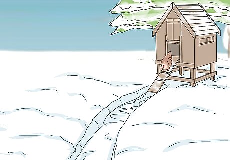 Clear a path to the chickens’ food source when it snows. If your area receives snow, it is important to make sure that your hen’s are able to reach their food source. Shovel a clear path from your hen's nesting area to the food source if it is obstructed by snow. Chickens don’t generally like walking through snow and will often stop eating for a period if they aren’t able to reach their food.