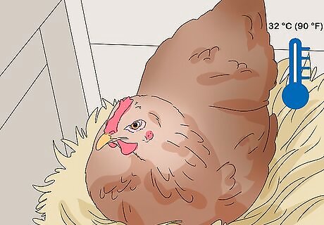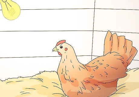 Keep the coop between 2 °C (36 °F) and 32 °C (90 °F). Chickens will lay more eggs if their body temperature is at a comfortable level. If your chicken coop falls below the recommended temperature range, use a heat lamp to warm the area. To save power, use a timer or a sensor to set the heat lamp to come on once it gets dark. Purchase a heat lamp from a vet, pet store, or supermarket. Keep the heat lamp at a safe distance from anything that could catch on fire. Hang the heat lamp at the manufacturer’s suggested height to ensure that it won’t burn the hens.