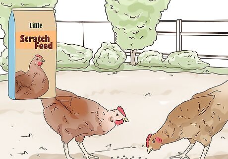 Give the chickens a little scratch feed occasionally, if desired. Chickens instinctively like to scratch at the ground and pick up small seeds, insects, grit, or greens to eat. This promotes chicken’s wellbeing, which promotes egg laying. Give your hens the scratch feed after their regular feed and only give them as much as they can eat in 20 minutes; otherwise, they won’t eat as much of their regular, more nutritious feed. Feed the chickens about 1 handful of food and see how long it takes them to eat it. Increase or decrease the amount as necessary in order to meet the recommended 20 minutes worth of feed. Natural grains such as corn, barley, oats, or wheat are great scratch feed options. Purchase these from a pet store or vet. If you like to give your chickens table leftovers, follow the same principle and remove any food that hasn’t been eaten after 20 minutes.