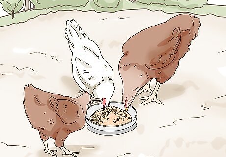 Put the pellets in a feeder that is long enough for all the hens to eat at once. This allows all of your hens to get an equal amount of food. This is especially useful if you have some hens that are more dominant than others. Long feeding troughs work well if you have lots of chickens. If you don’t use a feeder, spread the feed across the ground or provide multiple feeding stations so that all the hens have access to it at once.