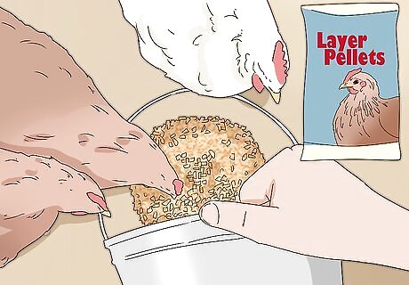 Feed your hens layer pellets with grit once they start laying eggs. Chickens require protein, fat, calcium, phosphorous, and vitamin D in order to lay eggs. These pellets are designed to give your hens all the nutrients they require to lay lots of large eggs with strong shells. CopRice, Fisken Feeds, and CountryMax are popular brands that sell layer pellets. The majority of layer pellets contain grit; however, it is worth checking the ingredients list to make sure that it is in the pellets. Check the packaging to determine how much feed to give your chickens. Generally, chickens require about 110 grams (0.24 lb) of feed per day.