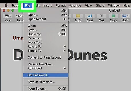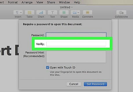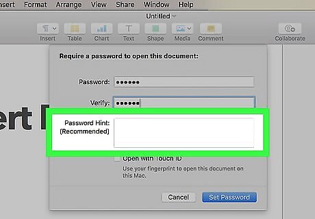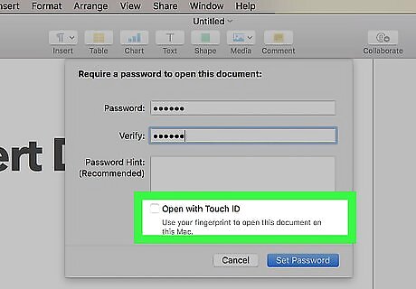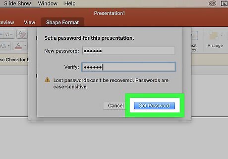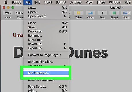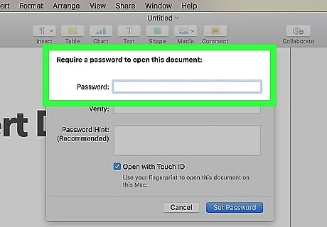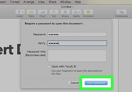 Click Set Password. It's a blue button at the bottom of the window. Doing so will lock the document with your selected password; when you try to open the document in the future, you'll be prompted to enter the password before you can proceed. If you send the document to another Mac user, they'll also have to know the password in order to open the document.