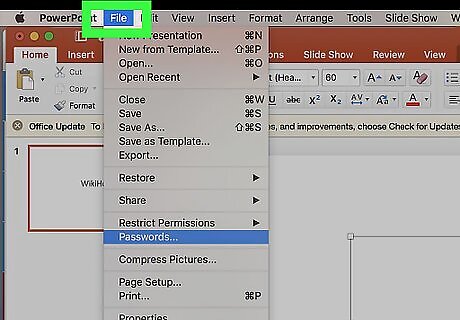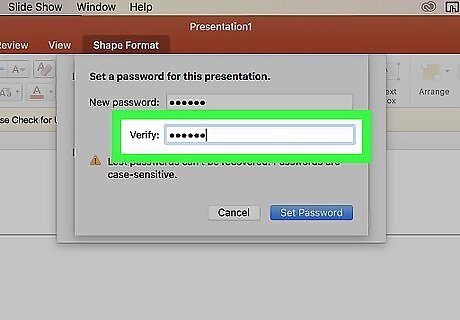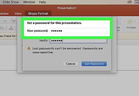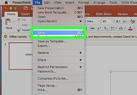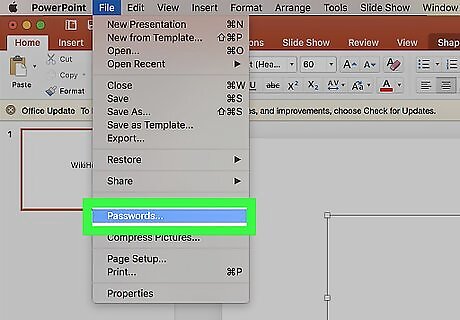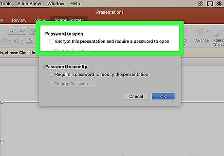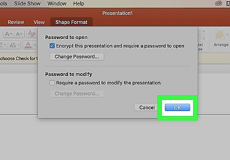 Save your changes. Press ⌘ Command+S to do so. Your PowerPoint presentation will now require a password in order to open. Your document will remain encrypted if you send it to someone, so they'll need to know the password in order to open the document.