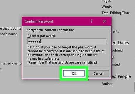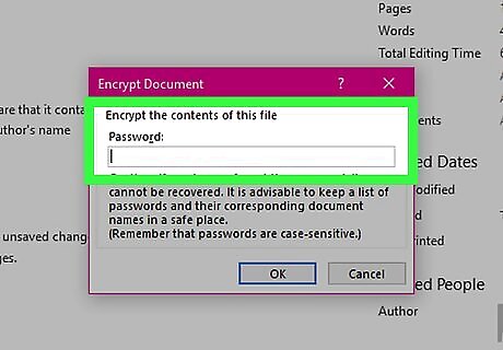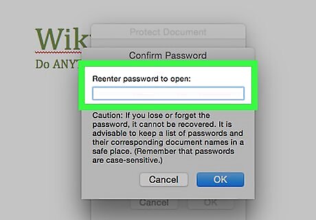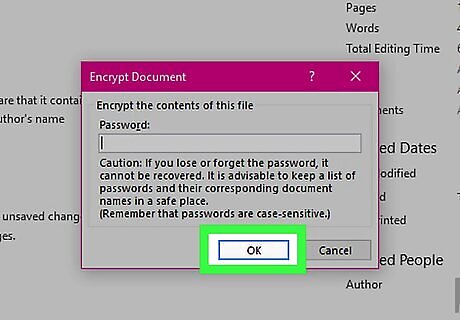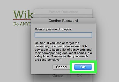 Click OK. This will apply your password to the document and close the window. Whenever you try to open the document in the future, you'll have to enter the password to complete the process. Your document will remain encrypted if you send it to someone, so they'll need to know the password in order to open the document.