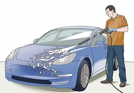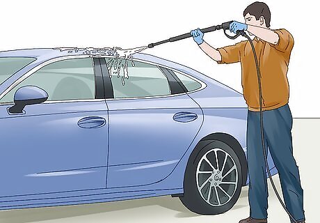 Rinse off the suds using the hose. Once you’ve wiped down the entire car using a soapy mitt, use the hose to rinse off all of the soap. Start at the top of the car as you rinse and work you way down, spraying the tires last to make the process easier. Wash your car every 2 weeks or whenever it gets dirty.