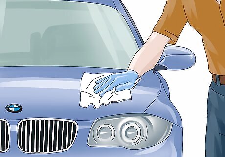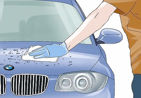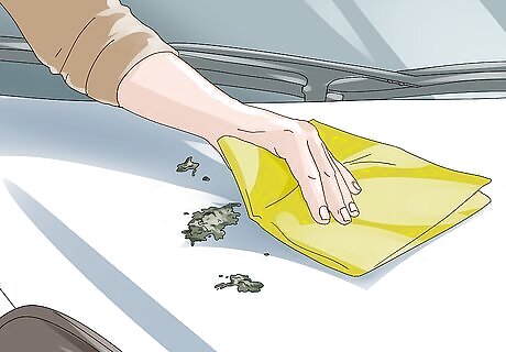 Clean off bird droppings or other stains as soon as you see them. Things like sap and bird droppings can quickly leave stains on a new car. As soon as you notice something on your car, wipe it off as quickly and thoroughly as possible using a clean cloth so it doesn’t leave a mark or damage the paint job. Keep paper towels or a clean cloth in your car in case you need to wipe something off of the glass or paint.