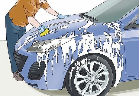 Dip a wash mitt into the soapy water and wipe down the car carefully. Wash mitts, which go over your hands, make washing cars easy—just dip the mitt into the suds and use your hands to wipe down the exterior. Use separate buckets and mitts for the paint and the tires to prevent any scratches. Rinse your mitt out in the bucket of regular water to get rid of any dirt that’s accumulated on the mitt. Many people like to wash the tires first before moving on to the rest of the car. It’s best to use separate buckets of water and mitts for tires because they’re the dirtiest part of the car.