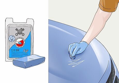 Clay your car only if your car’s surface feels bumpy. Claying your car is when you rub a piece of auto detailing clay along the exterior of the wet car to remove any bumps or imperfections. Feel the exterior of your car with your fingers—if you feel bumps, unwrap a clay bar and rub it along the painted or metal parts of the car in quick back and forth motions, removing the contaminants from the surface. If your car’s exterior feels smooth, it’s not necessary to clay your car. The bumps could be any sort of contaminant stuck on the surface of your paint. Purchase auto detailing clay from an auto parts store or online. Knead the clay once you notice bumps and pieces of dirt in it from the car’s surface so you don’t scratch the rest of the exterior. Only clay your car when you feel bumps along its surface.
