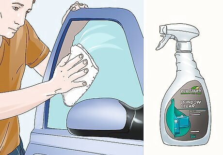 Wipe down the windows using an auto window cleaner. A regular window cleaner that you’d use in the house can actually damage your car’s tinted windows. Instead, purchase a window cleaner made specifically for cars. Spray each window with the spray before using a microfiber towel to wipe down the windows so you can see out of your windows clearly. A car window cleaner is great for removing smudges or dirt on the glass. Look for an auto window cleaner at your local auto parts store, big box store, or online.