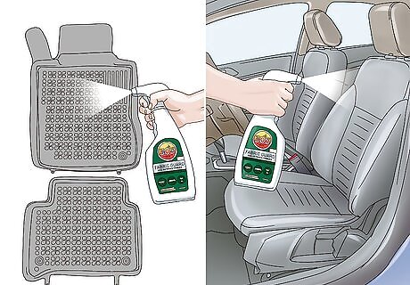 Treat the seats and carpet with a fabric guard right for the car interior. Remove the mats and spray them with a fabric guard to help repel liquids and stains. Apply the fabric guard to the seats as well, reading the bottle of fabric guard to ensure it will work on the type of upholstery you have in your car. For example, if your seats are made of leather, use a leather conditioner and protectant instead of a treatment designed for cloth interior.
