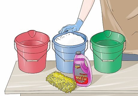 Fill 3 buckets with water and car shampoo for easy cleaning. One bucket is for soapy water, the second is for plain rinsing water, and the third bucket is purely for washing the tires. Fill 2 of the buckets with water and car soap to create a soapy lather and leave the third bucket full of clean water only. Using 3 separate buckets helps ensure you don’t accidentally rub dirt around on the car, ruining the paint job.