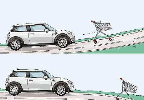 Park uphill so runaway objects won't hit your car. Shopping carts tend to hit cars most often, though anything that's round or has wheels can potentially damage your car. To avoid this, park at the back of parking lots or on a slight slope so that if something like a shopping cart does start to roll, it won't roll towards your car. Other objects like balls can hit or roll into your car as well, making it a good idea to park uphill.
