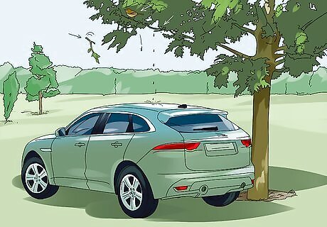Avoid parking under trees to stay away from sap and other potential damage. Whether you’re parking your car on the street or in a parking lot, try to steer clear of trees or other overhanging objects. Trees can leak sap onto your car and are a popular spot for birds to hang out, which can lead to unwanted bird droppings. Parking your car under a tree during autumn or when it’s super windy can also lead to leaf or tree damage.