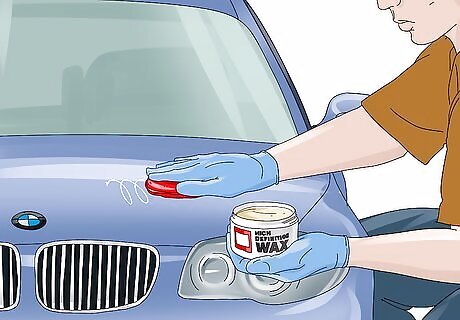 Wax the car using a wax applicator pad to add a layer of protection. Apply car wax to a wax applicator pad and wipe it onto the car using circular motions. Overlap your circles as you apply the wax, using small arm movements to create tight circles that won’t leave streaks on the exterior. Wax the entire surface of the car, covering the painted, metal, and plastic parts (like the headlights). Follow the instructions on the container of wax to ensure you're applying it correctly. Look for car wax at your local auto parts store, hardware store, or big box store. Wax your car 4 times a year to keep its surface protected.