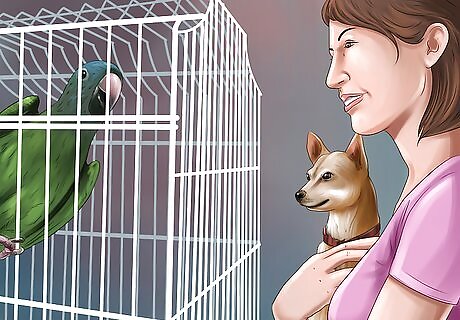 Let birds interact with other pets—with caution. You may have cats, dogs, or other animals you have as pets in addition to your bird. Familiarizing your pets with one another and supervising them can minimize the risk of harm to your bird. Make sure you are always present when your animals are together. Even if they are used to one another, there is no guarantee that an excited dog or cat won’t pounce on a bird. Introduce your birds and other pets gradually. Consider using a training program to help other animals interact with your bird.