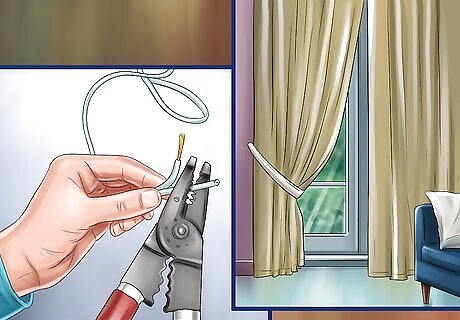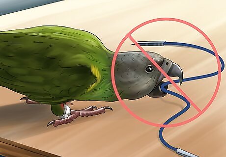 Remove living and dining room hazards. Birds love attention from their human and you may spend a lot of time with your pet in the living or dining room. Scan and remove potentially dangerous items such as including electrical wires and cords, toys, and curtains. This may prevent injury and even death. Check for dangling wires or cords from electronics including TVs, stereos, DVD players, telephones and lamps. Hide them to deter chewing by your bird. Consider covering electrical outlets to prevent electrocution through chewing. Get rid of frayed wires, which can also electrocute your bird.