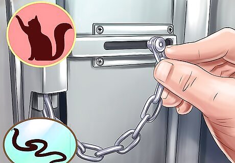 Secure cage doors and bars. Many people put their birds in cages while they are away. Some birds—and other animals—are clever and can open cage doors or sneak through the bars. Checking the locks and bars of your bird’s cage can keep it safe from escape and from curious other animals such as snakes or cats. Check that cage bars aren’t bent or damaged. These can encourage a curious bird to stick its head out of the cage, which may allow it to escape or wedge its body in between the bars. Bent or damaged bars may encourage other animals to poke their head into the cage. Make sure bar spacing is narrow enough to prevent the bird from sticking any of its body outside of the cage. Inspect latches and locks to make sure mechanically inclined birds and other animals can’t open them. Replace any potentially problematic pieces with new security features.